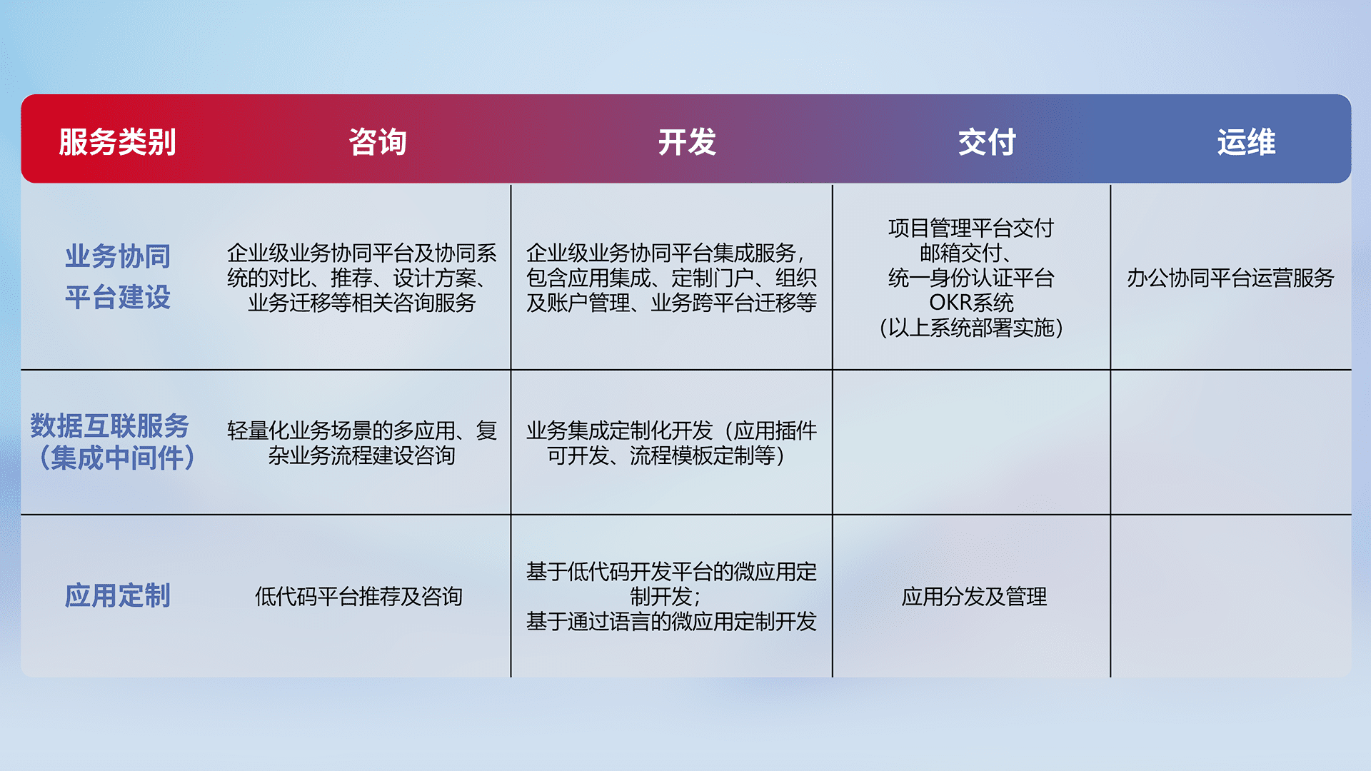 针对钉钉、、、企微、、IDaas等平台级产品提供产品的规划、、、方案、、、交付、、、、定制化开发等服务,,,实现如统一协同办公、、、智能客户服务、、、、混合会议管理、、智能数据查询、、、、等业务场景,,,实现数字化转型。。。。