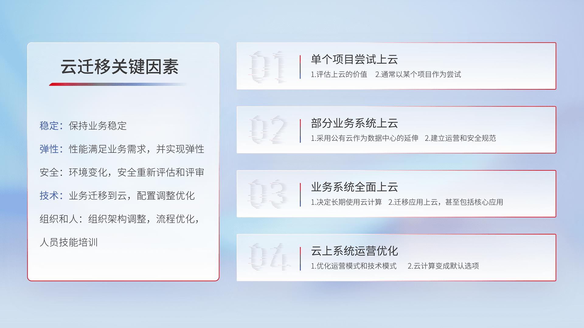 结合实际业务,,,,从规划设计、、、、云平台选型、、、、云原生改造、、、数据迁移、、、、集成交付,,,,迁移全过程为客户识别最佳上云路径,,做好风险识别管理,,,设计网络架构、、、、身份权限、、、、安全审计合规、、、操作审计、、、、日志审计、、、监控告警策略、、、、多站点容灾设计等,,对云上基础设施进行整体规划,,,提升IT治理水平,,以满足弹性、、、高可用、、、高性能的需求。。。