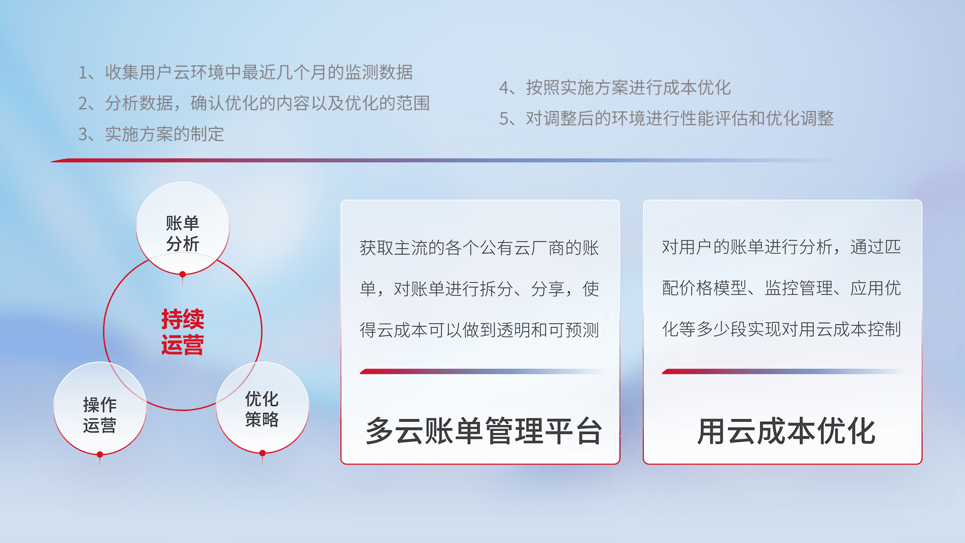 通过多云纳管,,,,以统一的资源数据模型把客户的云资源进行抽象和封装,,进而实现对多云资源的统一操作,,,,保障云资源管理的可靠性、、、、稳定性与可用性。。。。量身定制化运维内容,,配置、、、开发运维、、补丁管理、、、、备份、、、监控、、、认证和访问管理、、、、审计和日常巡检等,,,保障在用云过程中的可靠度,,,,稳定度以及高可用率。。